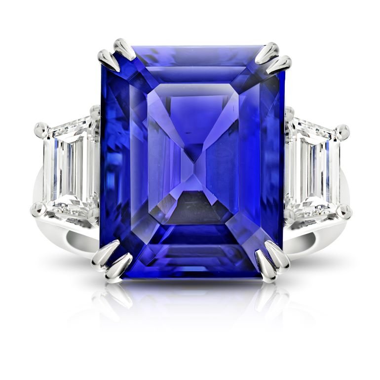 Details18.26 Carat Emerald Blue Tanzanite with 0.94 Carat Diamonds set in Platinum Ring |