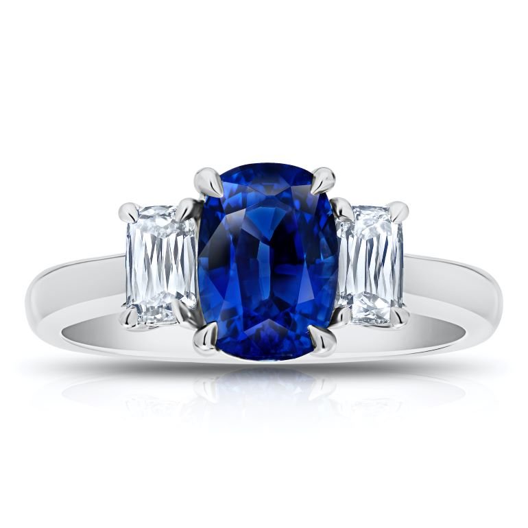 Details2.48 Carat Cushion Blue Sapphire with 0.75 carat Diamond set in a Platinum Ring