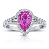 Details2.66 carat pear shape pink sapphire (no heat) with 2 tapered baguette diamonds .27 carats and 47 round diamonds .32 carats set in a platinum ring