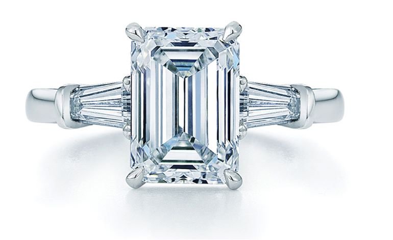 Details2.70 Carat Emerald Cut White Diamond with 0.36 Carat Diamonds set in Platinum Ring |