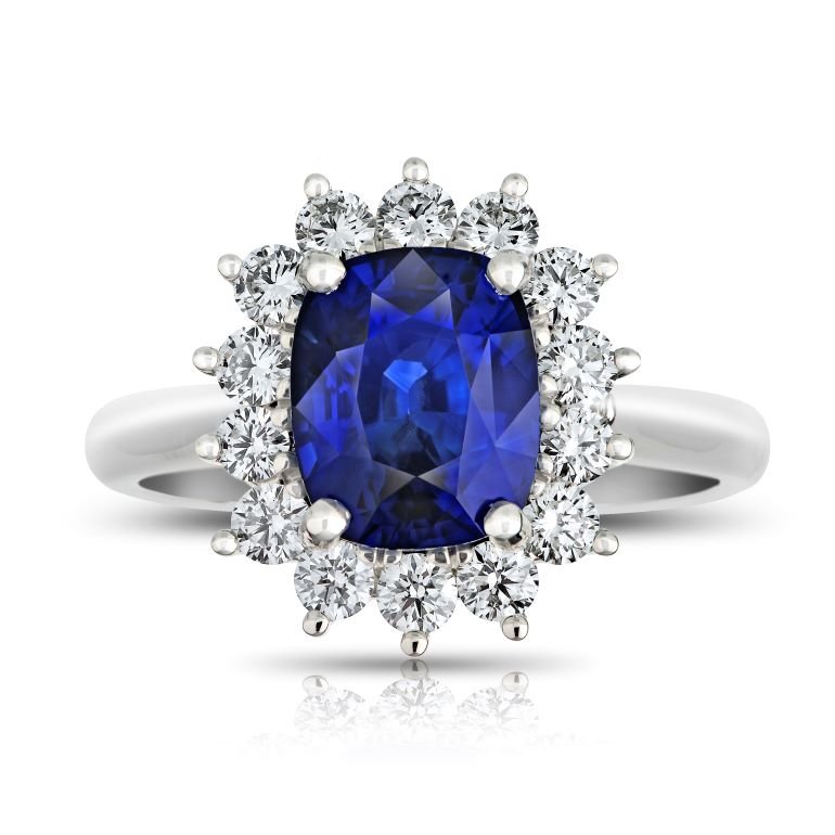 Details3.00 Carat Cushion Blue Sapphire and 0.68 Carat Diamonds set in Platinum Ring |