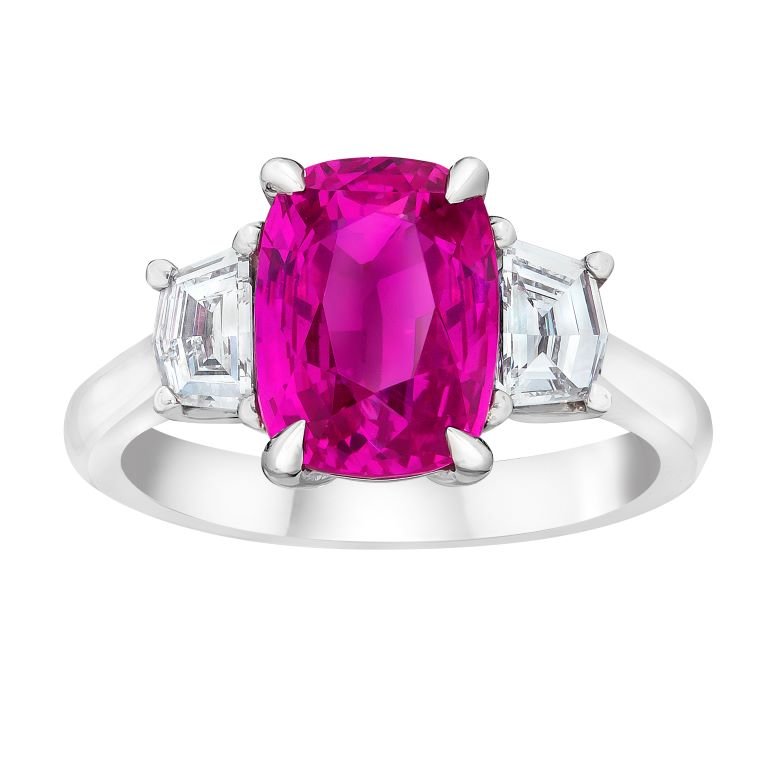 Details4.14 Carat Cushion Pink Sapphire with 0.69 Carat Diamonds set in a Platinum Ring |