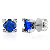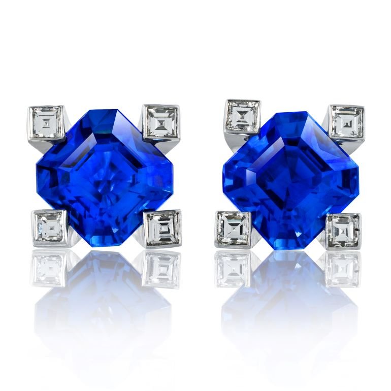 Details4.48 carat Emerald Cut Blue Sapphire (H) with eight Carre Diamonds 0.32 carats set in platinum earrings |