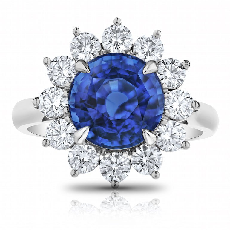 4.85 Carat Round Blue Sapphire with 12 diamonds 1.25 Carat set in a Platinum Ring