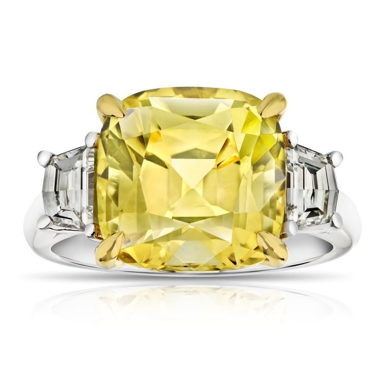 Details8.90 Carat Cushion Yellow Sapphire with 0.69 Carat Diamonds set in a Platinum Ring |