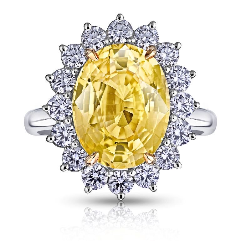 Details9.57 Carat Oval Yellow Sapphire with 16 Diamonds set in Platinum Ring |