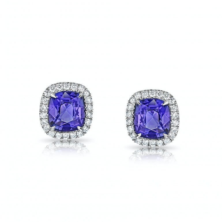 Details3.20 Carat Cushion Purple Sapphire with 0.34 Carat Diamonds set in a Platinum Earrings |