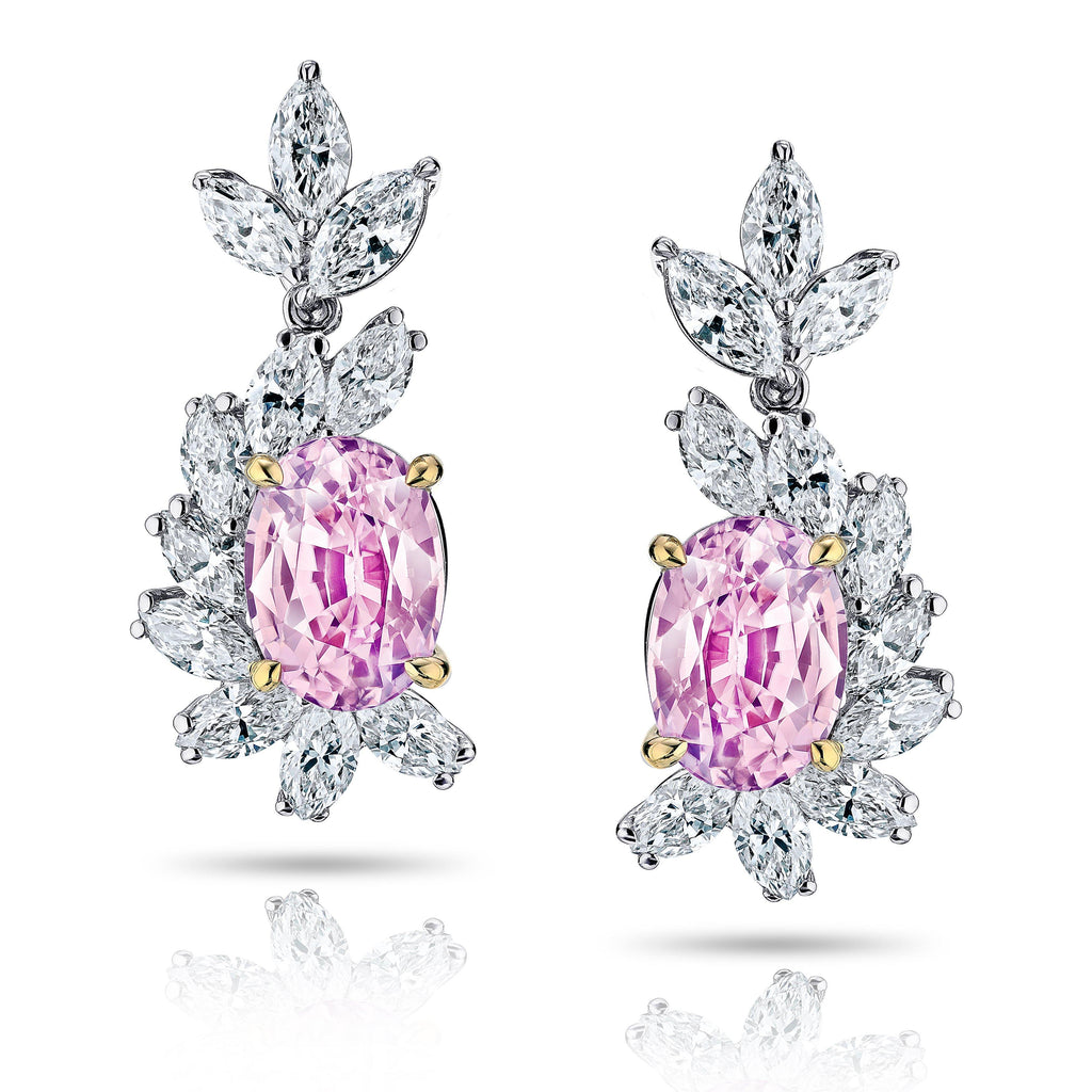 | Two Natural No Heat Oval Padparadscha Sapphires weighing 3.69 carats set with 22 marquise diamonds EF/VVS diamonds weighing 1.72 carats all set in hand made platinum earrings. |