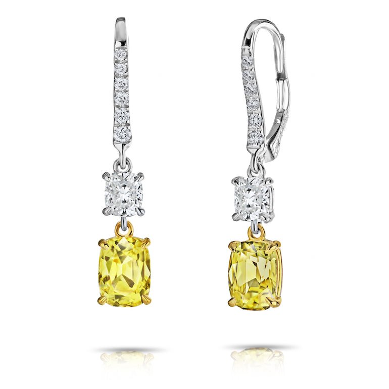 3.97 Carat Cushion Yellow Sapphire and Diamond Platinum Earrings
