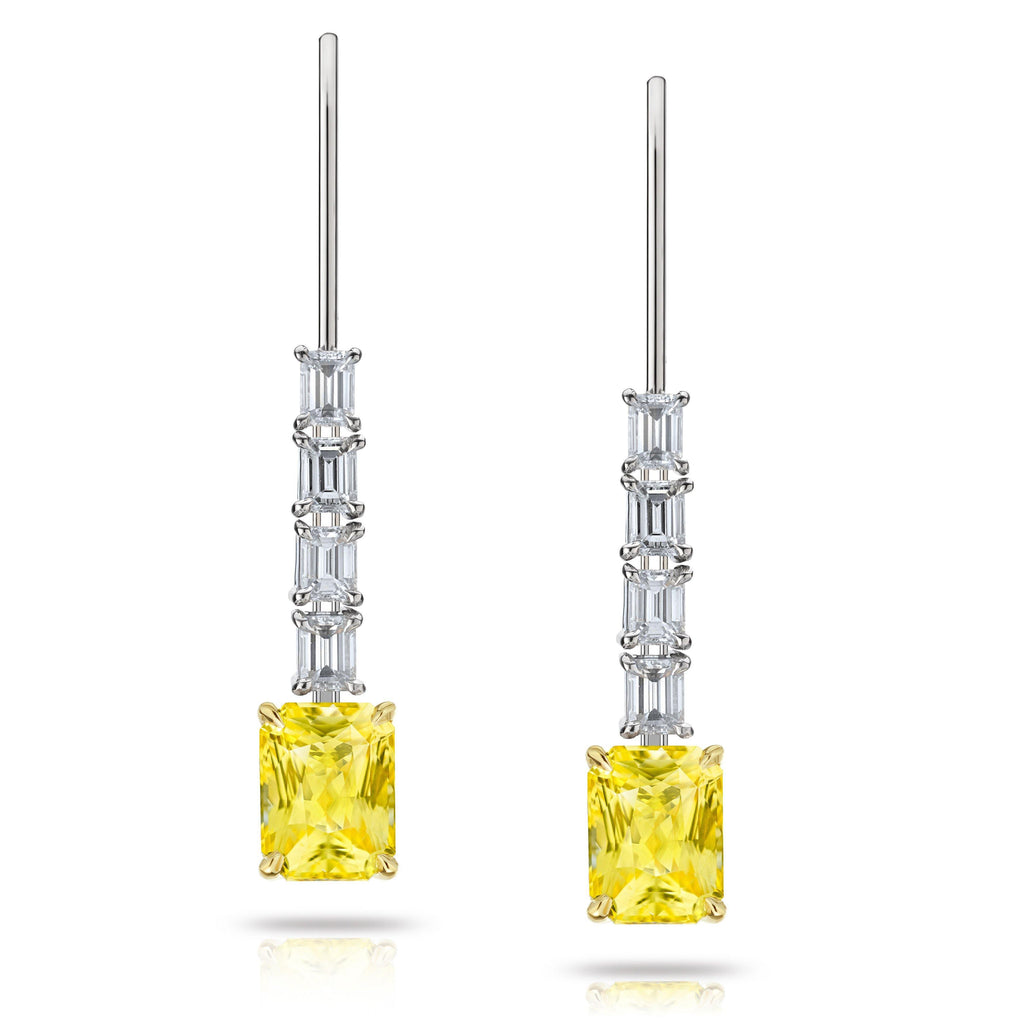 Details4.70 carat radiant cut yellow sapphires (no heat) with 8 emerals cut diamonds 1.25 carats set in platinum and 18k yellow gold lever back earrings