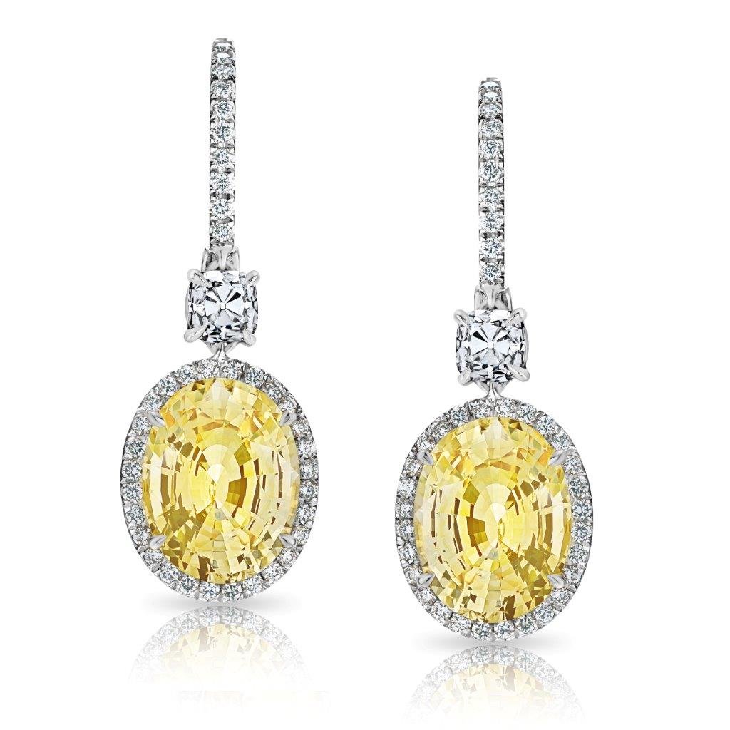Details8.54 carat Oval Yellow Sapphire with Diamonds weighing 1.29 carats two old mine cushions weighing .76 ctw and 76 round brilliant cut diamonds weighing .53 ctw set in Platinum and 18k Yellow Gold earrings. |