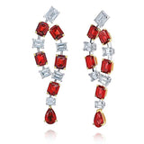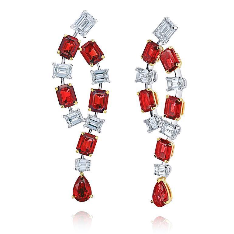 | 5.67 carats of emerald cut (10) and pear shape (2) natural no heat red rubies (no heat) with emerald cut diamonds (12) 2.89 carats set in platinum with 18k yellow gold push back drop earrings |