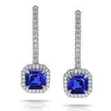 Blue Sapphire and diamond halo earrings with a total Sapphire weight of 1.77 carats and total diamond weight of 0.35 carats set on platinum lever backs.