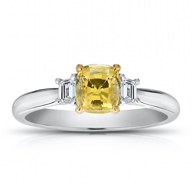 Details1.11 carat cushion yellow sapphire with trapezoid diamonds .26 carats set in a platinum with 18k yellow gold ring