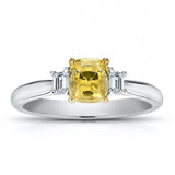1.11 carat cushion yellow sapphire with trapezoid diamonds .26 carats set in a platinum with 18k yellow gold ring
