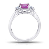 | 1.24 carat asscher cut natural no heat pink sapphire set with two mixed cut trapezoid diamonds weighing .51 carats set in platinum ring |