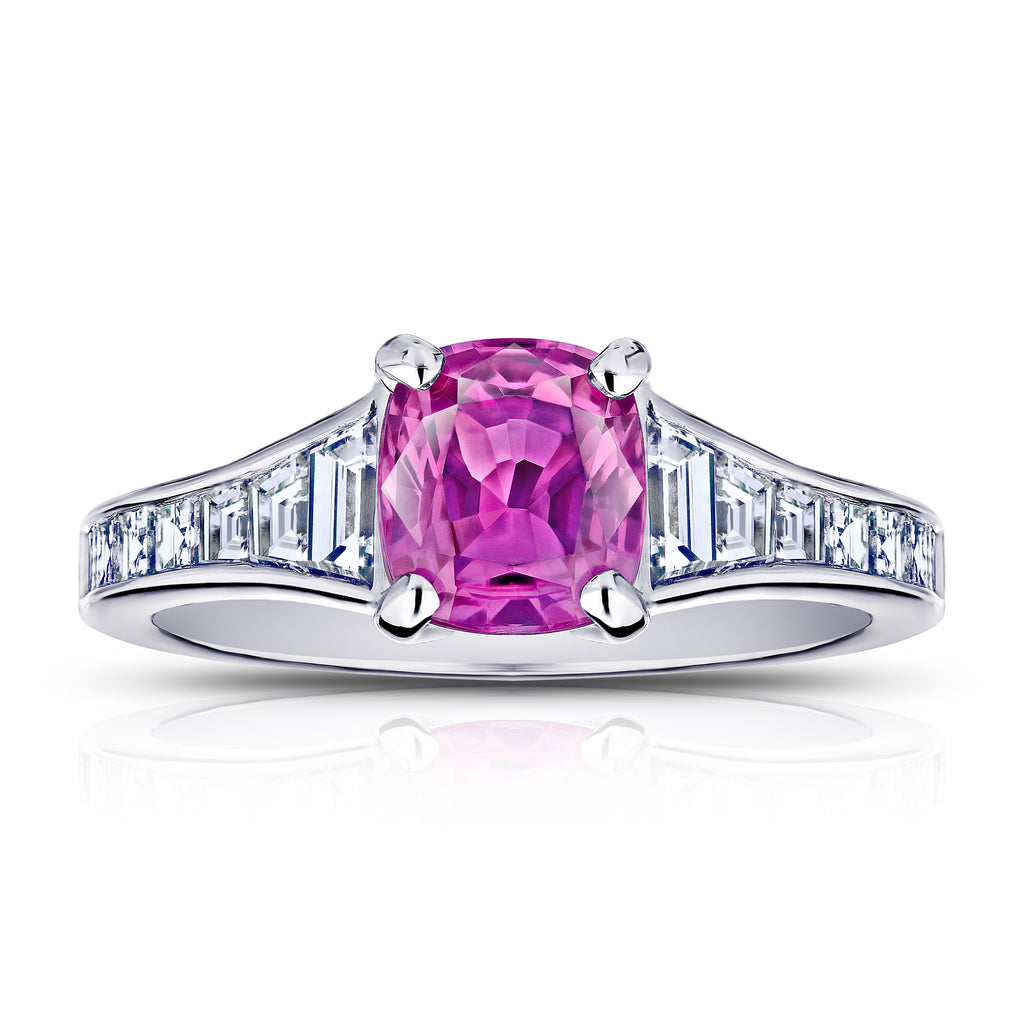 Details1.38 carat cushion pink sapphire with 14 trapezoid and carre diamonds .84 carats channel set in a platinum ring