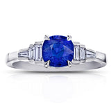 Details1.44 carat cushion blue sapphire with baguette and tapered baguette sides .31 carats (EF / VVS-VS) set in a platinum ring |