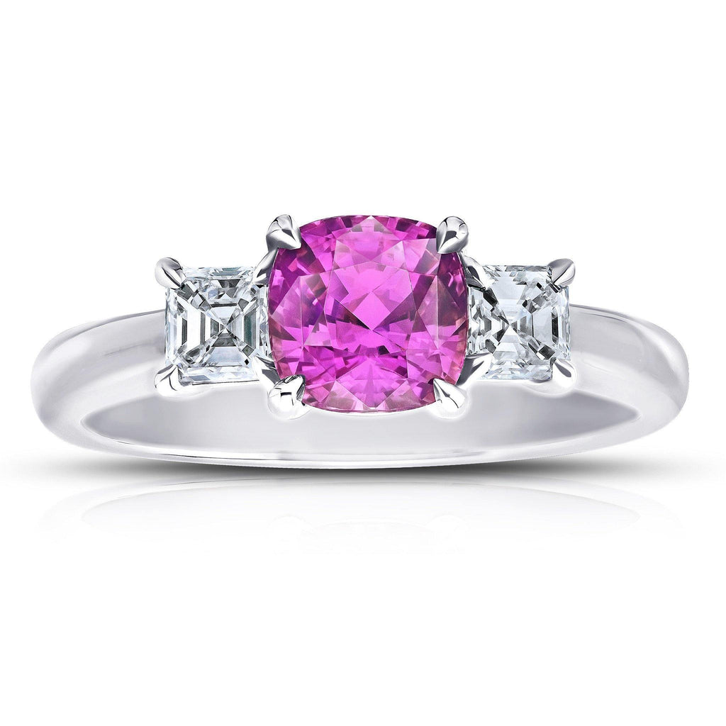 Details1.58 carat pink cushion sapphire with square emerald diamonds .56 carats set in platinum ring