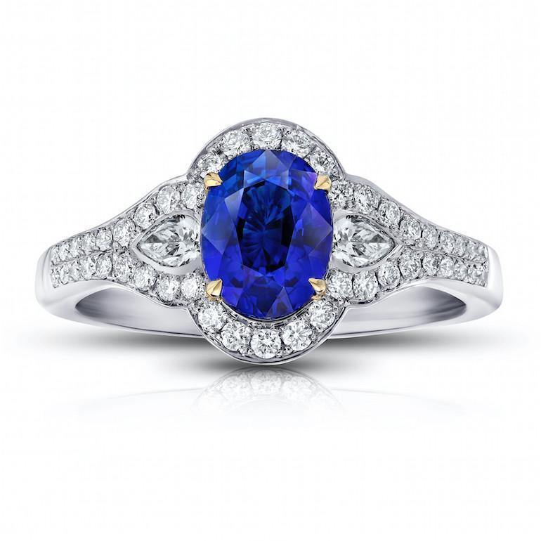 Details1.63 carat oval blue sapphire with 2 pear shape diamonds .22 carats and 46 round diamonds .31 carats set in a platinum with 18k yellow gold ring