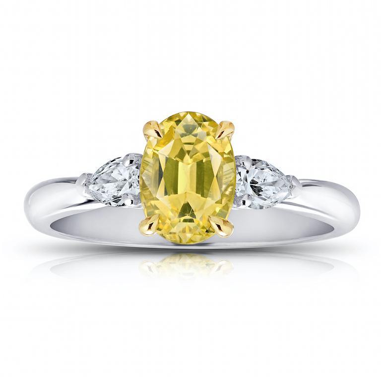 Details1.66 carat oval yellow sapphire (no heat) with pear shape diamonds .32 carats set in a platinum with 18k yellow gold ring