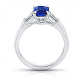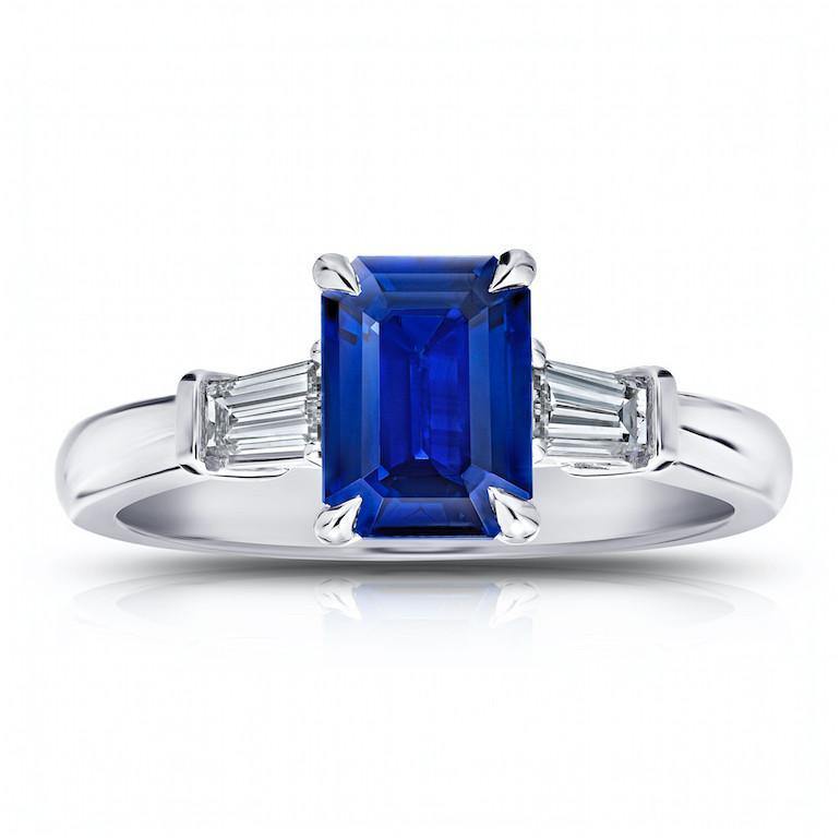 Details1.76 carat emerald cut blue sapphire with tapered baguette diamonds .40 carats set in a platinum ring