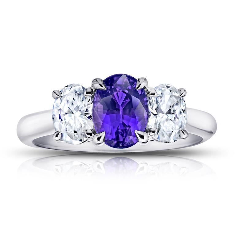 | 1.78 carat Oval Purple Sapphire set with two oval diamonds weighing 1.00 carats (GIA - F /VS) set in platinum ring |