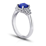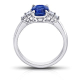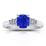 1.87 carat cushion blue sapphire with 4 step trapezoid diamonds .35 carats set in platinum ring.