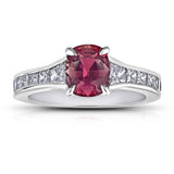 1.88 carat Padparadscha cushion (natural no heat) sapphire with two trapezoid diamonds and fourteen princess cut diamonds weighing 1.16 carats set in platinum channel set ring.