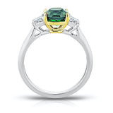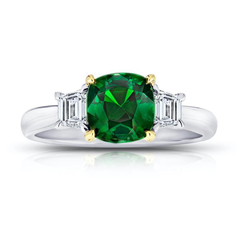 1.93 carat Cushion Green Tsavorite with trapezoid cut diamonds weighing .40 carats set in platinum & 18k Yellow Gold Ring.