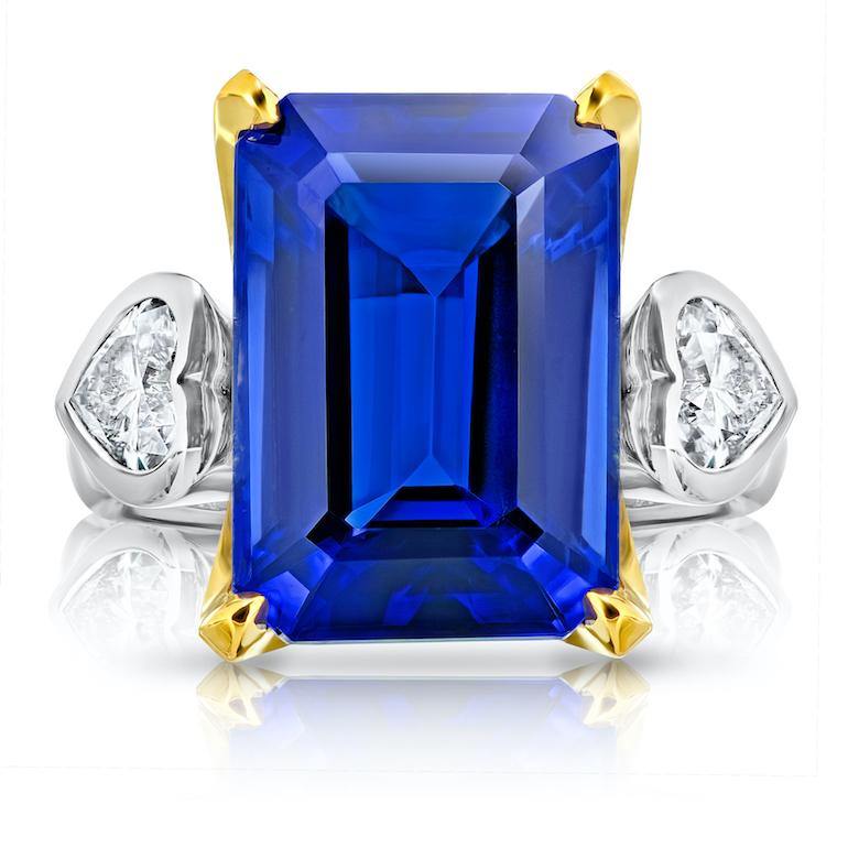 Details13.97 carat Blue Emerald Cut Tanzanite set with two Heart Shape diamonds .91 carats set in Platinum and 18k yellow gold ring.