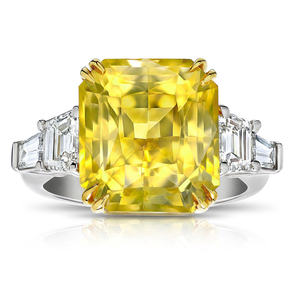 Details14.25 Carat Radiant Cut Yellow Sapphire Ring, with diamonds weighing 1.59 carats
