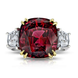 18.37 carat cushion red spinel with trapezoid diamonds 1.35 carats set in a platinum and 18k yellow gold ring