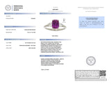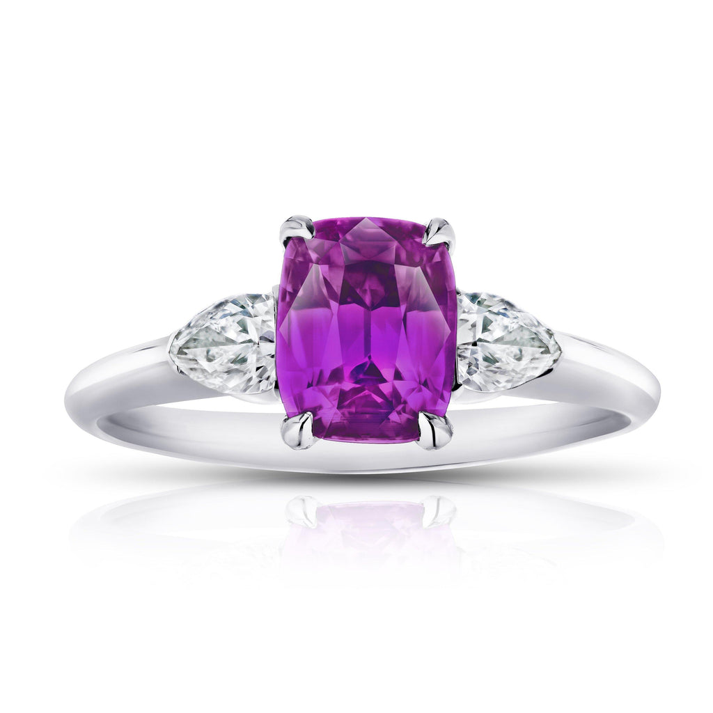Details2.05 carat cushion pink sapphire with 2 arrow shape diamonds .43 carats and 24 round diamonds .06 carats set in a platinum ring. |