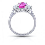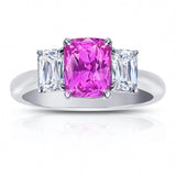 Details2.50 carat Pink Cushion Sapphire ring with diamonds weighing 1.06 carats set in a custom platinum mounting.