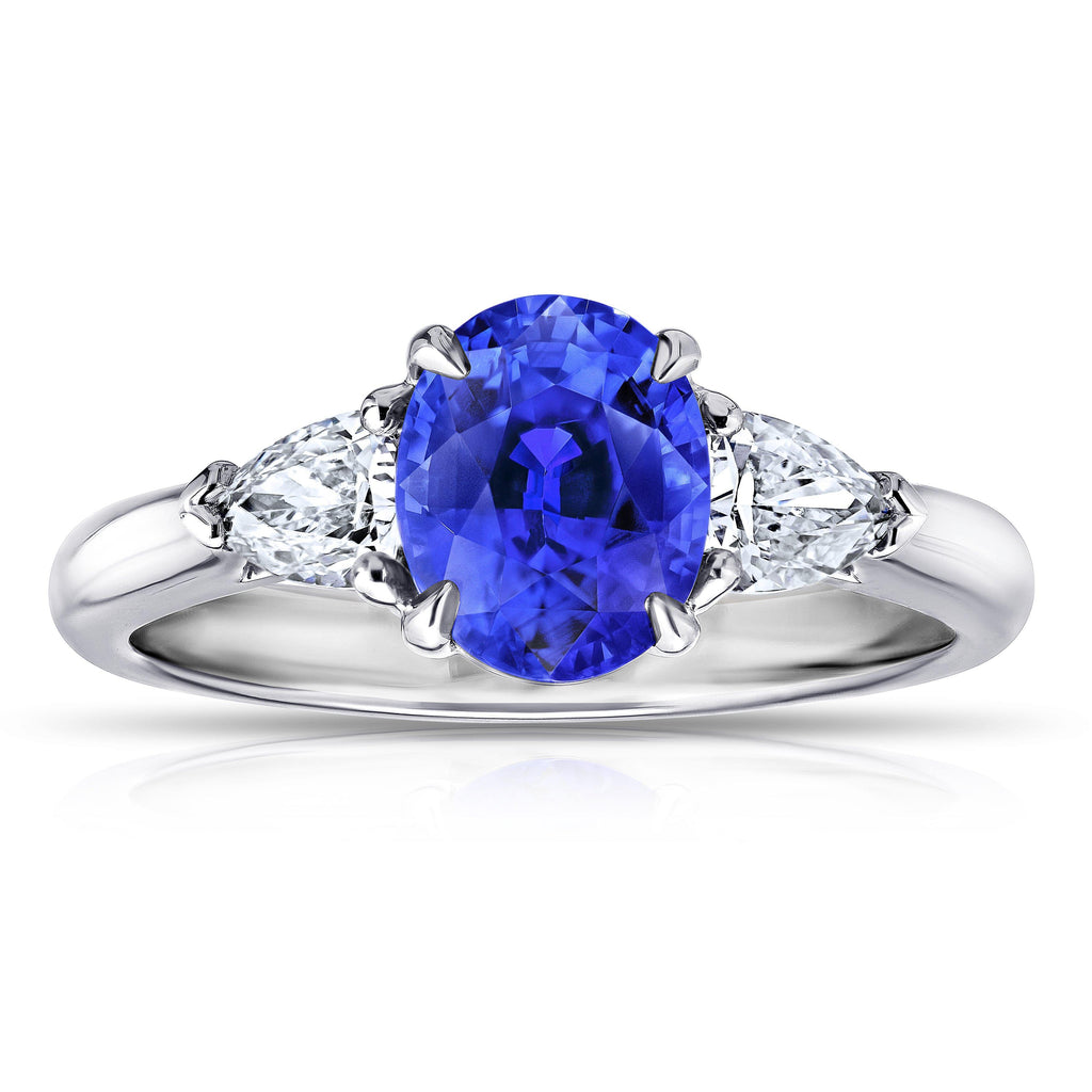 Details2.16 carat oval blue ceylon sapphire with arrow cut diamonds .52 carats set in a platinum ring