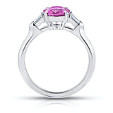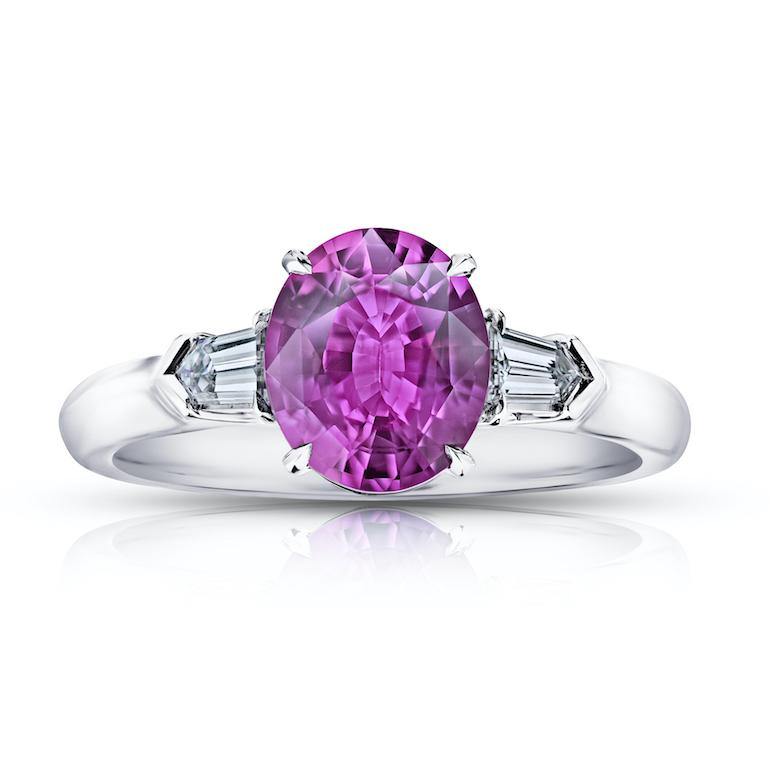 Details2.19 carat no heat pink oval sapphire with bullet shaped diamonds .33 carats set in a platinum ring