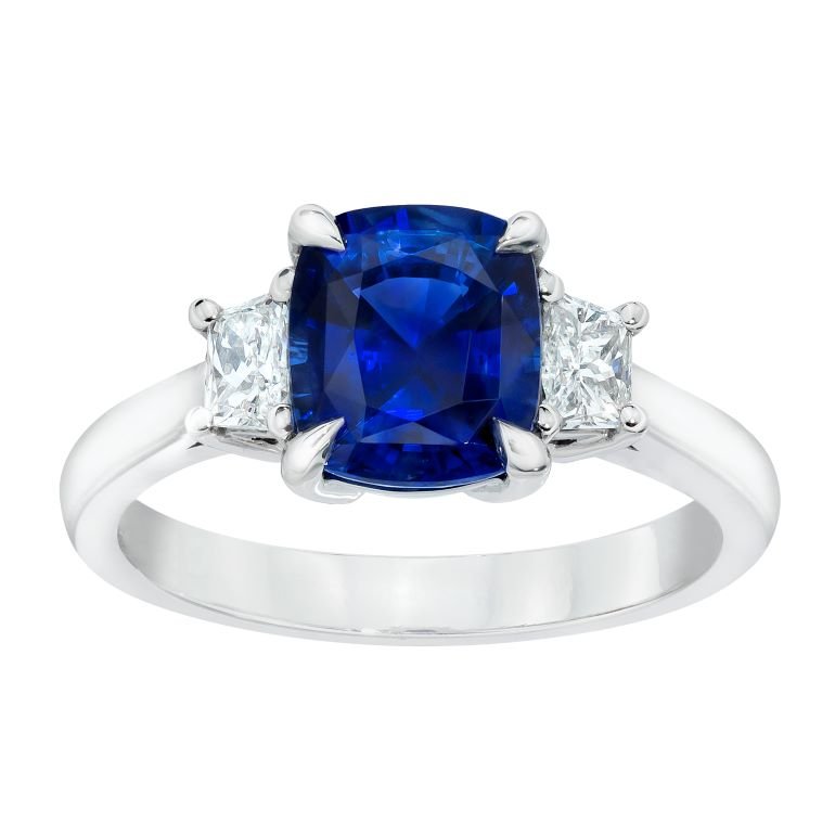 Details2.37 Carat Cushion Blue Sapphire with 0.42 Carat Diamonds set in a Platinum Ring |