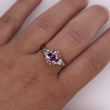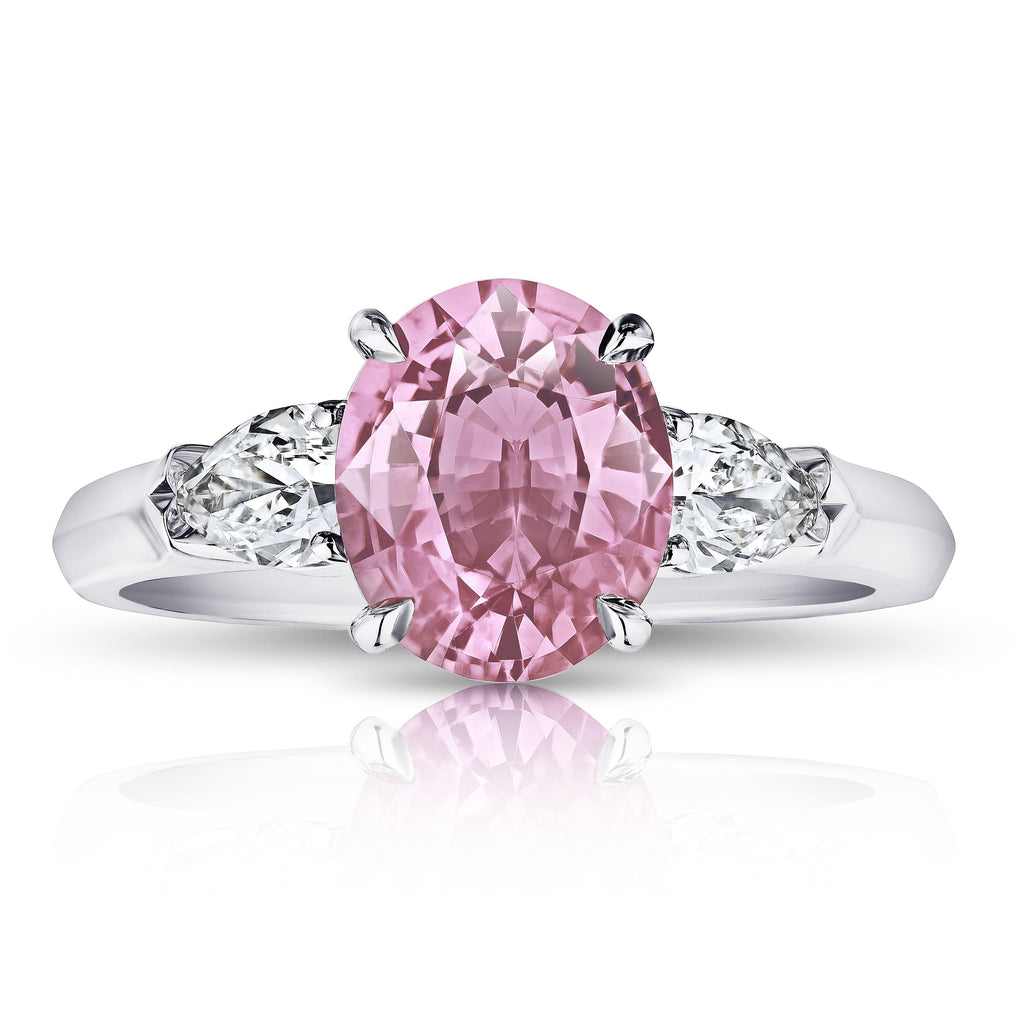 Details2.37 carat oval padparadcha sapphire with arrow shape diamonds .49 carats set in a platinum ring
