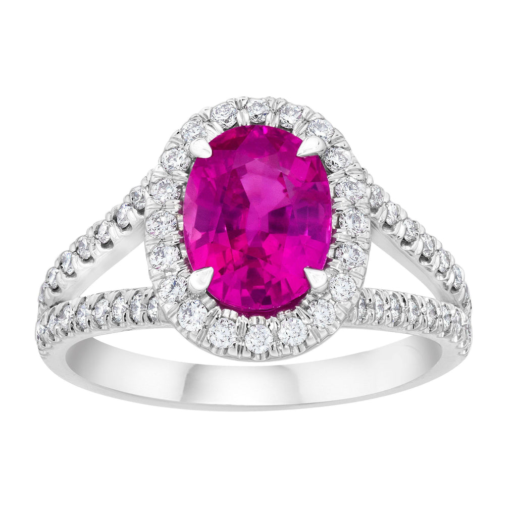 Details2.47 carat oval pink sapphire and round diamonds set in a platinum split shank ring |