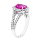 2.47 carat oval pink sapphire and round diamonds set in a platinum split shank ring