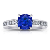 Details2.51 carat blue square cushion sapphire with 20 carre cut diamonds .93 carats set in platinum channel ring.