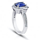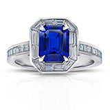 Details2.55 carat blue emerald cut sapphire with 12 baguette cut diamonds and 16 carre cut diamonds weighing 1.07 carats set in platinum ring |