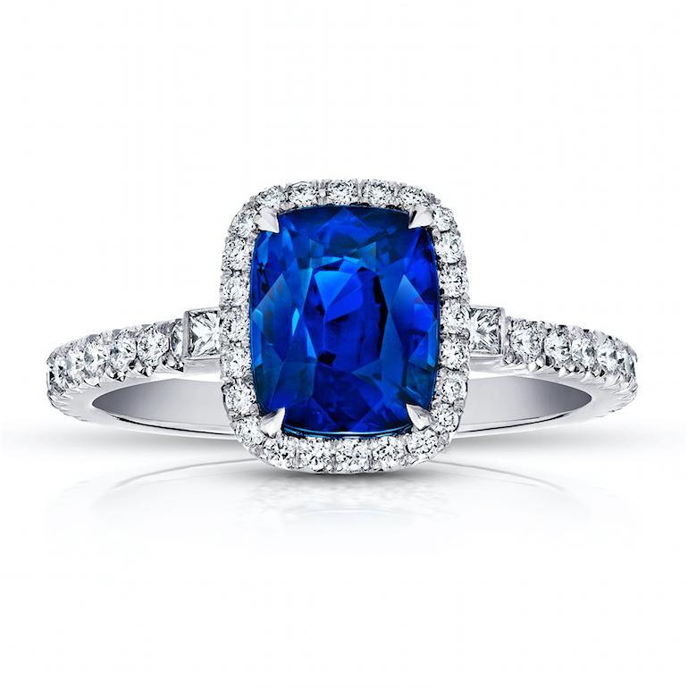 Details2.63 carat cushion blue madagascar sapphire (no heat) with 2 princess cut diamonds .05 carats and 44 round diamonds .33 carats set in a platinum ring