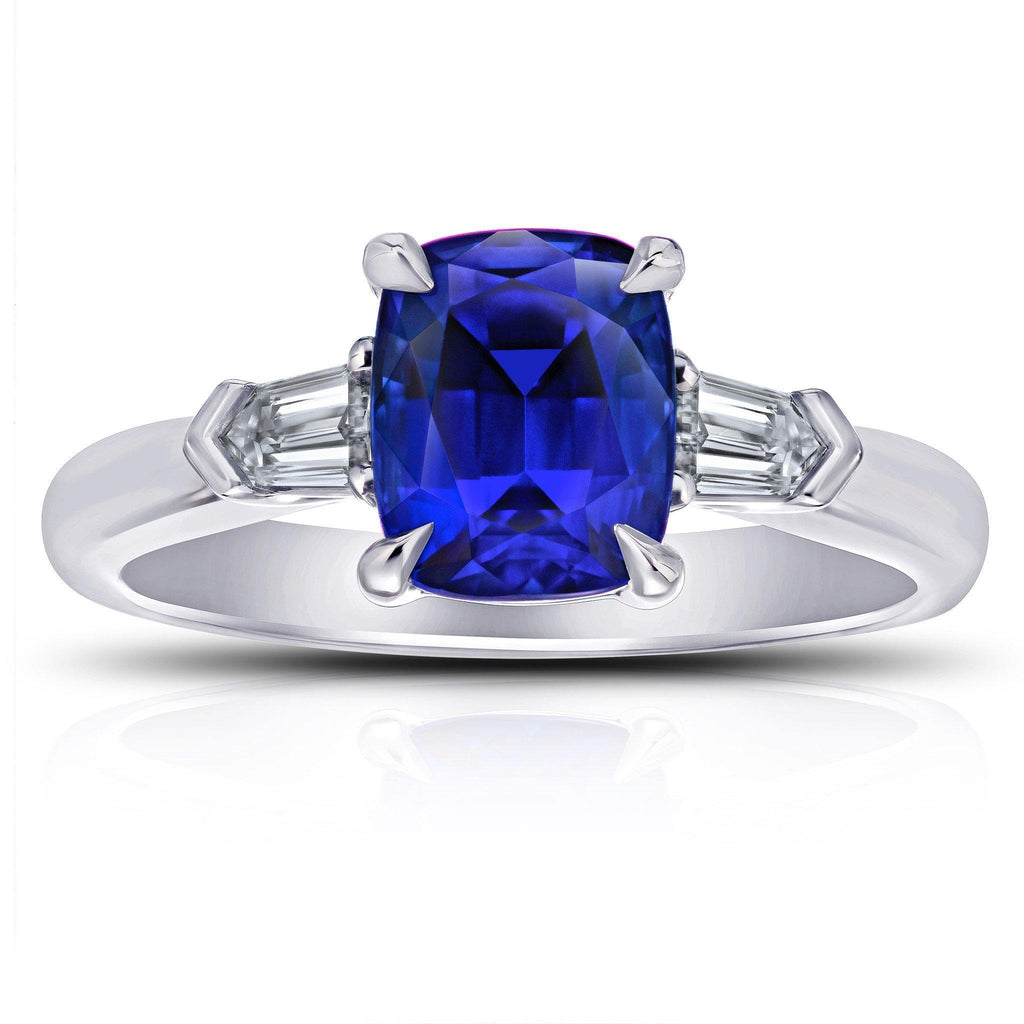 Details2.79 carat Blue Sapphire Cushion Ring with bullet shape diamonds .32 carats (F, VS1-VS2)