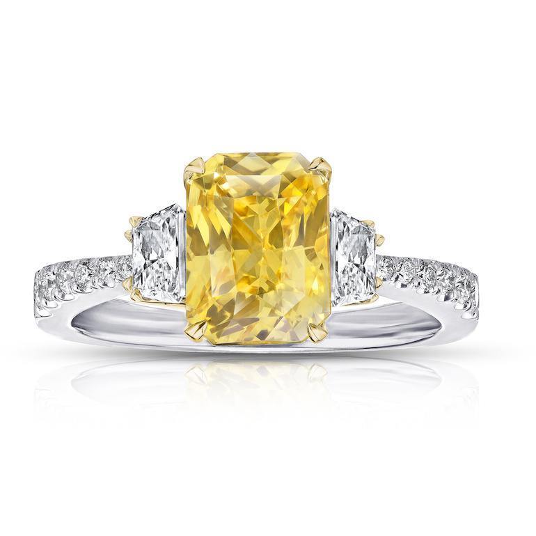 Details3.01 carat radiant yellow sapphire (no heat) with trapezoid diamonds .52 carats and round diamonds .15 set in a platinum and 18k yellow gold ring