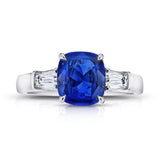 3.02 carat cushion blue sapphire (NH) with tapered emerald cut diamonds .51 carats set in a platinum ring.