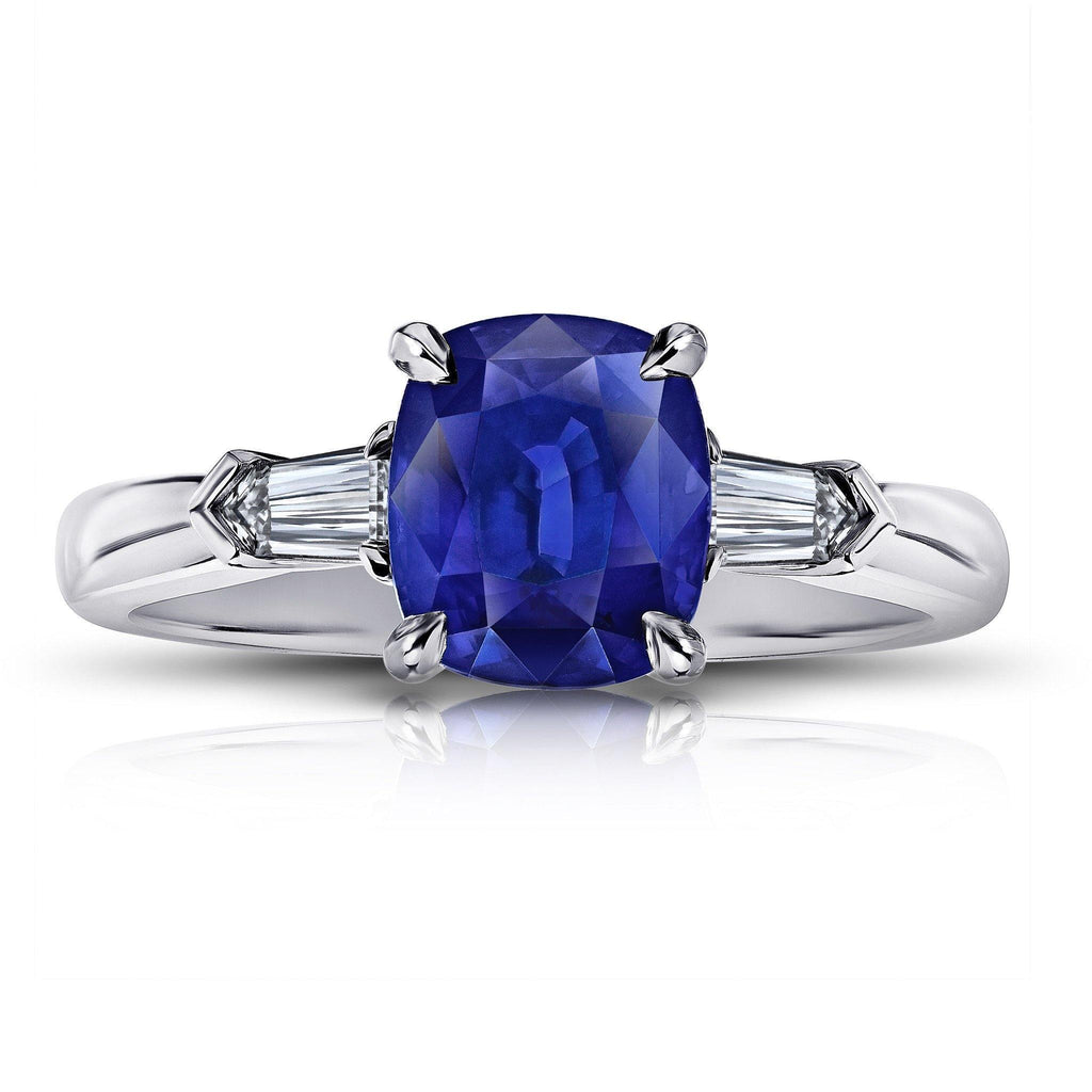 3.07 carat blue cushion sapphire ring with bullet shape diamonds .31 carats set in platinum.
