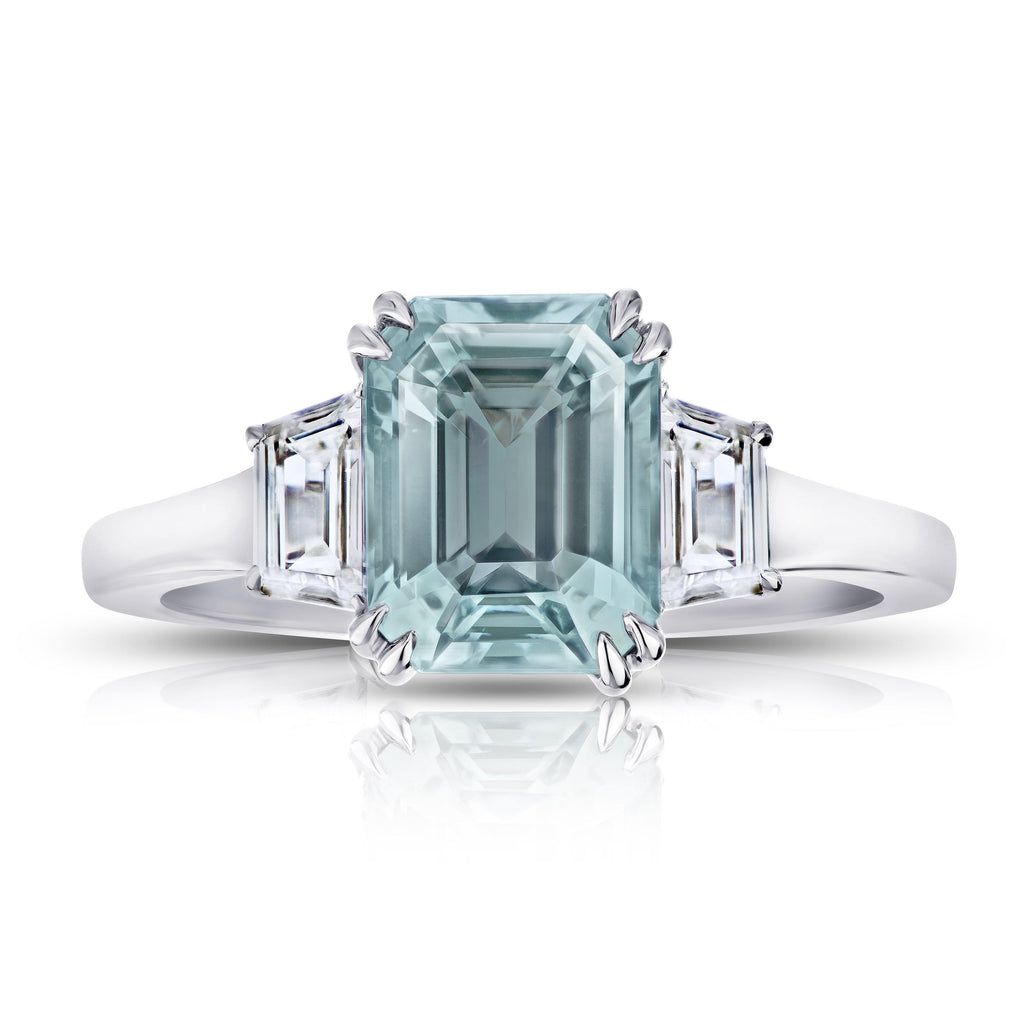 3.12 carat emerald cut bluish green sapphire (NH) with trapezoid step cut diamonds .93 carats set in a platinum ring.