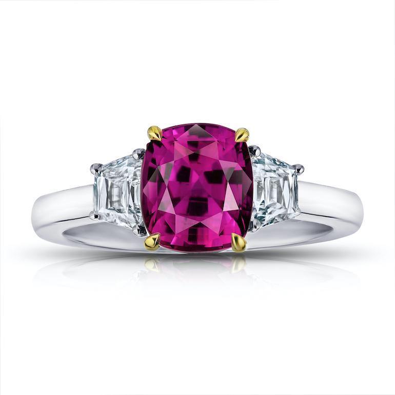 Details3.18 carat red cushion ruby with trapezoid diamonds .69 carats set in a platinum with 18k yellow gold ring |